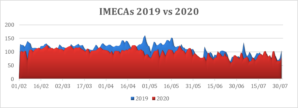 Como podemos observar en la gráfica anterior para los días 2, 18, 24 y 25 de julio de 2020, los niveles sobrepasaron en al menos 15 puntos imecas a los del año anterior, a pesar de las restricciones gubernamentales del semáforo rojo epidemiológico que entró en vigor dos meses antes.