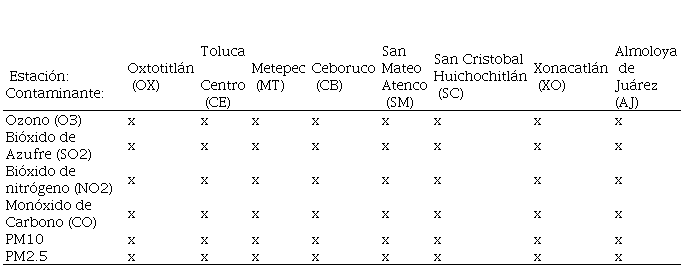 Análogamente, este artículo incluyó la información obtenida de la Red Automática de Monitoreo de la Zona Metropolitana de la Zona Metropolitana de Toluca (RAMA), operada por la Secretaría de Medio Ambiente del Gobierno del Estado de México. Dicha red consta de 8 estaciones de monitoreo -como la que se presenta en la Imagen 1- repartidas en el territorio del Valle de Toluca como se muestra en la Imagen 2 y todas miden los siguientes contaminantes: O3, SO2, NO2, CO, PM10 y PM2.5 tal como lo indica la tabla 2. Además, funcionan como estaciones meteorológicas que miden distintos parámetros climatológicos. Cada contaminante tiene un rango de concentración límite con base en criterios de salud ambiental, por lo tanto, para estandarizar dichas concentraciones se emplea el índice metropolitano de calidad del aire (IMECA), el cual es una herramienta para informar sobre los niveles de contaminación de una manera fácil. La Tabla 1 indica la interpretación de la calidad del aire conforme a los puntos IMECA: