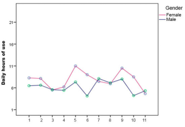 One of the objectives of the study was to analyze the main uses in addictive behavior, daily hours of use and their interaction with both genders. The sample reported more addictive behavior, with the main use of knowing people. Those who did not report a specific activity reported the least addictive behavior score. On the other hand, females reported a greater number of connection hours than males. Both reported more daily hours dedicated to the activity of sharing and expressing themselves. Although interaction with friends and partners was one of the most popular uses, it did not report a greater number of connection hours or characteristics of addictive behavior than the other activities. Recent studies have found that the frequency of use is directly related to leisure activities, school / work activities and communication [41].
