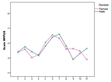 Likewise, the nonparametric test of Kruskal Wallis was performed to analyze the difference between the different uses. Significant differences were found between the main uses of social networks and problematic mobile phone use (?2 [10] = 46.15, p <.001). It was analyzed using a generalized linear model to measure the inter-subject effect test between the addictive behavior to social media and the variables gender and main uses of social media (see Figure 3). Significant differences were found in the corrected model (F [21] = 2.76, p <.001; R2 = .119), reporting a moderate size effect through the Eta square analysis (?2 = .119). Interception was also significant (F [1] = 683.13, p <.001, ?2 = .615). No significant interaction was reported between the main use factors and gender (F [10] = 4.29, p = .95, ?2 = .009). This is due to the fact that the gender did not have an effect on the mobile problematic use (F [1] = 0.06, p = .81, ?2 = .001), however there was a significant effect with the different uses (F [10] = 4.29, p <.001, ?2 = .09).