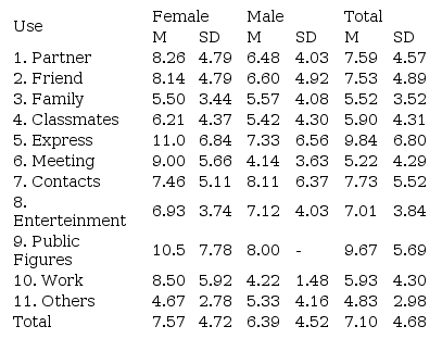 Before data analysis, it was necessary to re-categorize the main uses to specifically identify the uses, without leaving aside some that could be differentiated, so that there were a total of 11 categories that would cover the uses reported by the young people. Among the most popular uses in general were to be in contact with friends, entertainment, and to be in contact with their partner. No significant difference was reported between uses and gender, the main uses being the same for both genders. Although there are studies that indicate some differences, it has also been found that both males and females use social media with similar purposes [39][40].