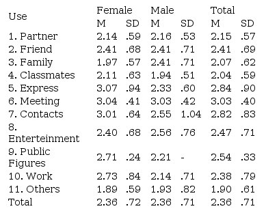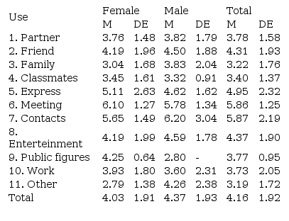 To analyze the differences between the main uses and the problematic mobile use between both genders, the descriptive analysis was performed. The main use that reported the highest score was the content of their contacts, followed by the use to meeting people. Females and males reported higher scores on the scale of addictive behavior to social media in meeting people and viewing contact content (see Table 4).