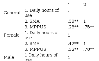 Since a normal distribution was not fulfilled, it was decided to analyze the relationship of the variables by Spearman's nonparametric Rho correlation analysis (see Table 5). First, the correlation of the variables in general was analyzed and finally analyzed divided by gender. There was a high and significant correlation between the addiction to social media and the mobile problematic use (rs = .75, p <.01), however the relationship with the daily hours of use was lower (rs = .38, p < .01 and rs = .28, p <.01). Females tended to have higher scores on the variables in relation to the daily hours of use.