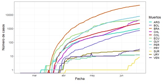 Figura 2. Número total de casos, en escala logarítmica, al 20 de junio de 2020 en diversos países de Suramérica