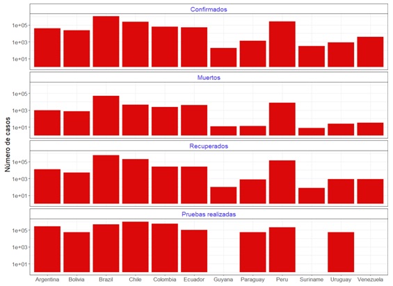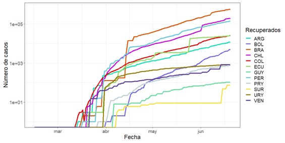 Podemos observar que el país con mayor número de casos confirmados en Suramérica es Brasil, seguido por Perú y Chile. Al poseer el mayor número de casos confirmados y por la dinámica propia del de la enfermedad, estos países poseerán el mayor número de recuperados, tal como se evidencia en la Figura 3.
