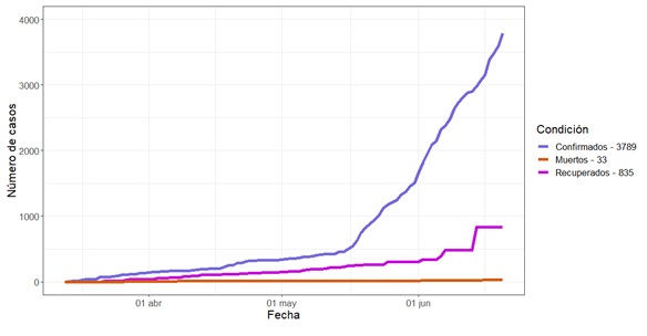 En la Figura 4 se muestra la evolución temporal de los casos confirmados, muertos y recuperados en Venezuela al 20 de junio y se exhibe una evolución exponencial. Aunque el número de muertos solo representa el 0.87% de los contagiados, el incremento del número de casos día a día es alarmante.