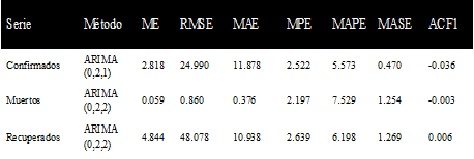 Este tipo de método, por su complejidad, requiere el uso de series temporales largas, aunque se observa que se ajusta correctamente al comportamiento observado. Box y Jenkins recomiendan como mínimo 50 observaciones de la serie temporal diarios y para la fecha, la extensión de los datos en las series de Venezuela es de 141 datos.