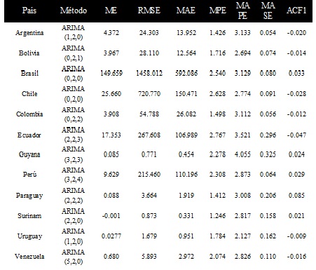 Argentina, Surinam, Uruguay y Venezuela (modelo ARI), la predicción se ajusta a procesos autorregresivos de diferentes órdenes, pero integrados de segundo orden.