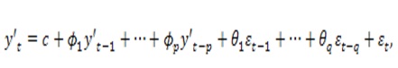 Donde es la serie temporal diferenciada (uno puede diferenciar más de una vez), los parámetros son las medias móviles, los parámetros son los terminos autoregresivos y es ruido blanco.
