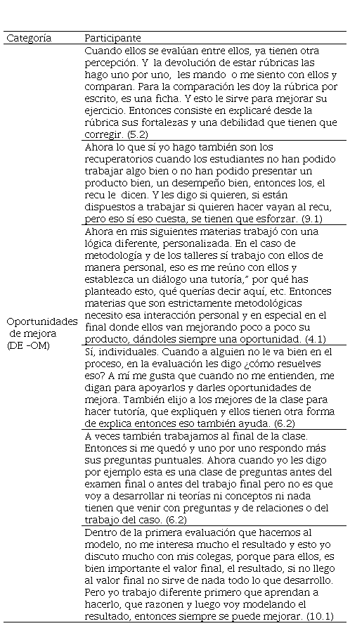 8. Se identifica la puesta en marcha de andamiajes para la evaluación formativa tales como tutorías, clases repaso, retroalimentaciones individuales y grupales, comentarios escritos que permiten generar espacios y momentos importantes en la formación basada en competencias como son la retroalimentación y las oportunidades de mejora (Tobón, Prieto y Fraile, 2016).