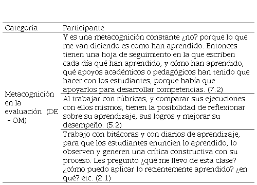 En el discurso y prácticas de los docentes se encuentra que trabajan con estrategias de reflexión y toma de consciencia de lo que aprenden los estudiantes. Por lo tanto, recurren a estrategias que generan procesos metacognitivos, un aspecto considerado relevante en el desarrollo de competencias porque permite la posibilidad de crítica, comprensión profunda y la posibilidad de transferencia de los aprendizajes.