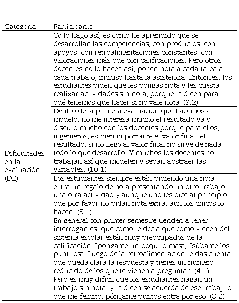 En la mayoría de los casos estas dificultades los docentes las centran en dos aspectos: primero, la cultura de evaluación de los otros docentes que no han cambiado a la evaluación del enfoque basado en competencias y segundo, la cultura de la evaluación que los estudiantes han interiorizado desde la escuela, con malas prácticas y concepciones que son complejas en su abordaje. Sobre la primera dificultad se encuentran las afirmaciones de la tabla 12.