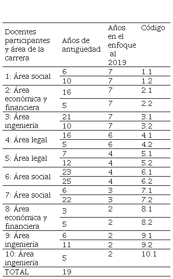Después de la invitación a participar en la investigación, se entrevistaron a 19 docentes, debido a que uno no asistió. La tabla 1 muestra las características de cada docente, según carrera, vinculación, años de antigüedad y tiempo en el nuevo enfoque: