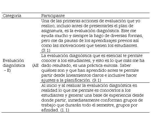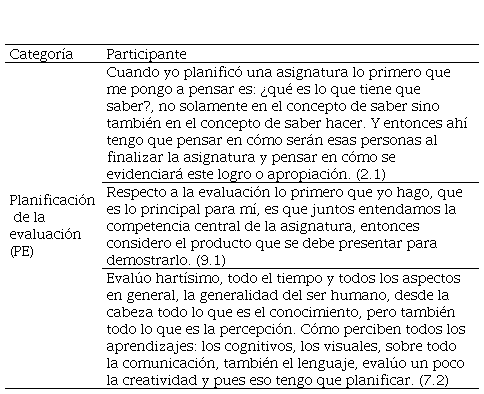 Como parte de la planificación también está el inicio de todo el proceso de evaluación que varios docentes hicieron hincapié que esta inicia con la ejecución desde el primer día de encuentro con los estudiantes en las asignaturas, en donde se delinea la forma de trabajo. Para estos docentes la evaluación debe ser clara y otros la ven como parte de un acuerdo entre partes.