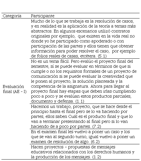 Estas entrevistas se realizaron con una guía de preguntas, en la categoría correspondiente a la evaluación que es el objeto del presente artículo, se formularon dos pregunta generales y guías y sobre éstas se realizaron otras más específicas en función a cada entrevista con el fin de lograr la profundidad deseada. La guía de preguntas tenía como preguntas: ¿Cómo realiza la evaluación de asignaturas? (planificación, comunicación y gestión) ¿qué estrategias utiliza? Y ¿cómo devuelve al estudiante la evaluación?