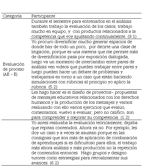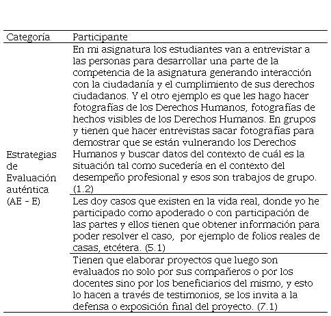 De la misma manera, los docentes valoraron sus acciones como prácticas que han sido positivas y eficientes permitiéndoles desarrollar competencias en los estudiantes. Son estas experiencias dinámicas que preparan a estudiantes para diversos modos y momentos de actuación profesional. Al considerar varias estrategias ligadas a ámbitos socio-laborales, así como instrumentos diversos para la evaluación (Cano, 2008; Tejada, 2011;Tejada y Ruiz, 2016).