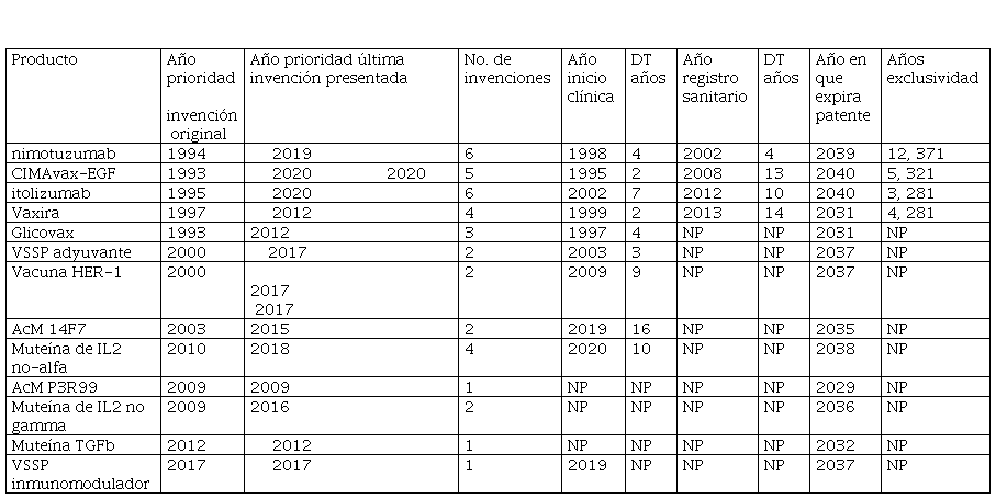 Se analizó la estrategia de PI y se calculó el tiempo promedio entre la presentación de cada solicitud de patente para dos de los productos innovadores registrados por el CIM y comercializados actualmente y dos en investigación clínica. Específicamente los productos registrados estudiados fueron la vacuna CIMAvax-EGF y el AcM nimotuzumab. La vacuna CIMAvax-EGF induce la producción de anticuerpos contra el factor de crecimiento epidérmico (EGF) y está registrada en Cuba desde el año 2008 para el cáncer de pulmón de células no pequeñas en estadios avanzados. El nimotuzumab reconoce al receptor del EGF y está registrado en Cuba desde el año 2002 para el tratamiento de tumores de cabeza y cuello, gliomas, y carcinoma de páncreas. El AcM humanizado comúnmente denominado 14F7 y que reconoce al gangliósido N-glicolil GM3 el cual se encuentra sobre-expresado en tejidos tumorales fue uno de los productos en evaluación clínica estudiado. El otro producto en evaluación clínica analizado fue una Muteína de la IL-2, a la que comúnmente llamamos Muteína de IL-2 no alfa y que se caracteriza por poseer de cuatro a cinco mutaciones en la secuencia primaria de la IL-2 que le permiten mostrar una activación preferencial de las linfocitos T CD8+ y células NK en relación con los linfocitos T reguladores.