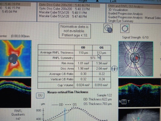 · 2do caso. ?Masculino 12 años, sensorio conservado, con hiperpigmentacion de la piel, escleras normales, tórax y abdomen normal, espasticidad de extremidades inferiores, hipogonadismo, visión 20/20 sin corrección, DISCROMATOPSIA hace un año, oct normal de macula, oct de disco óptico evidencia papila excavada.
