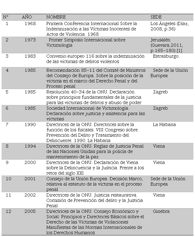 El ´Convenio Europeo sobre Indemnización a las Víctimas de Delitos Violentos´. 1983. La definición de ´Víctima´, por primera vez, en La ´Resolución 40-34 de la ONU´. Declaración sobre principios fundamentales de la justicia para las víctimas de delitos y abuso de poder. 1985. Las recomendaciones a los estados integrantes de la Organización de las Naciones Unidas y de la Unión Europea, emanadas de los diferentes eventos internacionales en favor de las víctimas, las cuales pueden resumirse como sigue: Sustitución del esquema Estado-delincuente, por el de Estado-Víctima-Delincuente, priorizando la ´Reparación Integral de las Víctimas´ y su plena satisfacción en cualquier decisión asociada a la sanción penal, su ejecución o libertad del delincuente. Modificación constitucional y de los instrumentos jurídicos relacionadas con procedimientos penales, a fin de incorporar las reivindicaciones pertinentes a las víctimas y una integración más activa por parte del gobierno, en la asistencia médica, psíquica y moral. La creación de mecanismos estatales para indemnizar a las víctimas, a la hora de que estas no puedan, por los procedimientos legales, lograr su reparación o los infractores no posean medios para subsanar el daño. Garantizar que los delincuentes cubran con sus propios medios las afectaciones patrimoniales, morales y psíquicas ocasionadas a las víctimas.