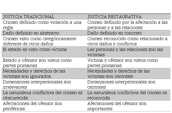 Este decurso ha dado paso a un concepto que se alía en favor de los afectados por el delito, denominado, ´Justicia Restaurativa´, caracterizado por Tonche y Umaña (2017, p. 232-234) como un modelo novedoso y alternativo deslindado del modelo de justicia tradicional, en donde el punto focal tiene que concentrarse en “…la restauración de las personas y los daños que emergen de una cierta situación problemática. Esta es considerada como su principal novedad, porque busca un desplazamiento de la atención de la justicia penal al daño causado a la víctima y a la sociedad. Grosso modo: lo más importante de este modelo es restaurar, no punir.” En esta senda, Melo, Ednir y Yazbek (2008, p.192) nos presentan un cuadro comparativo para ilustrar la diferencia entre ambos planteamientos: