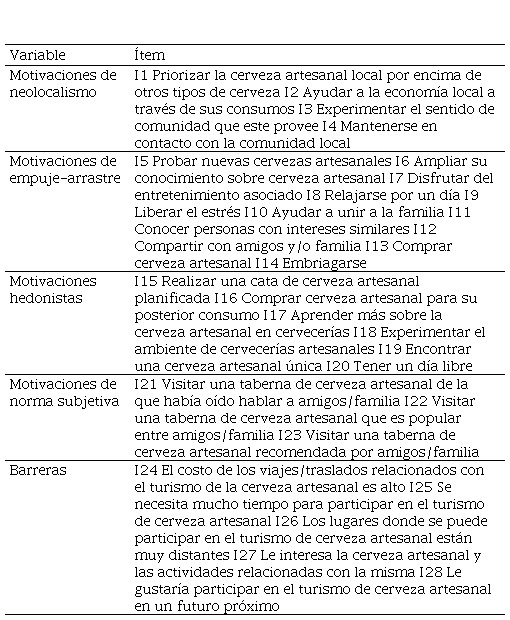 El cuestionario constó de 28 ítems que permitieron medir motivaciones y barreras para realizar turismo de cerveza artesanal mediante una escala de Likert de 5 puntos, siendo 1 “Totalmente en desacuerdo” y 5 “Totalmente de acuerdo”. Adicionalmente, el referido instrumento contempló 6 preguntas sobre características demográficas y socio económicas, a más de 5 preguntas sobre hábitos de consumo y actividades vinculadas con el sector de la cerveza artesanal en el país.