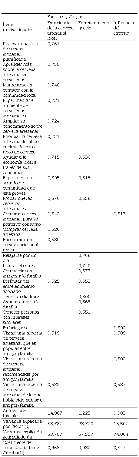 En cuanto al análisis factorial exploratorio sobre las motivaciones para optar por turismo de cerveza artesanal, se distinguieron tres factores: experiencia de la cerveza artesanal local; entretenimiento y ocio; e influencia del entorno, siendo el primer factor el que explicó el mayor porcentaje de varianza en cuanto a la importancia dada a los ítems relativos a la experiencia de la cerveza y su consumo localmente.