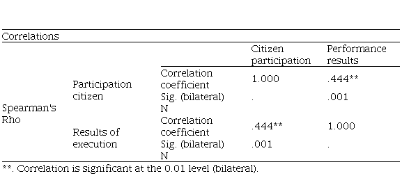 It was determined that there is a moderate and positive correlation with a correlation value of Spearman's Rho = 0.444 and p = 0.01<0.01 between citizen participation and the results of participatory budget execution in district and provincial municipalities in Peru. This indicates that the greater the citizen participation, the better the results of participatory budget execution.