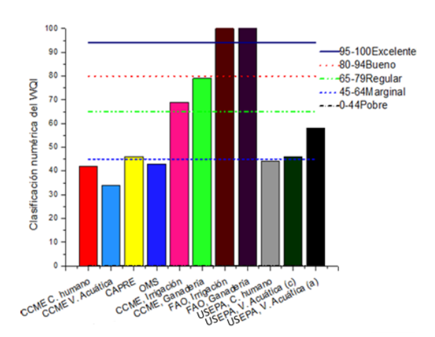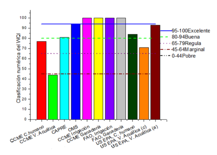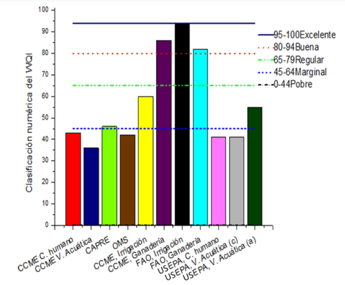 Se calculó el índice de calidad de agua utilizando el software CWQI 1.0 desarrollado por la CCME que proporciona la manera más conveniente para resumir datos complejos y facilitar su interpretación. El CWQI incorpora tres elementos: a) Alcance, número de variables que no cumplen los objetivos de calidad del agua; b) Frecuencia, número de veces que no se cumplen estos objetivos; y c) Amplitud, cantidad por la que no se cumplen los objetivos. El índice produce un número entre 0 (agua de menor calidad) y 100 (agua de mejor calidad), por lo que la calidad del agua se puede clasificar en categorías: Excelente (95-100), Buena (80-94), Regular (65-79), Marginal (45-64) y pobre (0-44). El índice se puede usar tanto para monitorear cambios en un sitio a lo largo del tiempo como para realizar comparaciones entre sitios (CCME, 2001). El software de índice de calidad de agua aplica la siguiente ecuación: