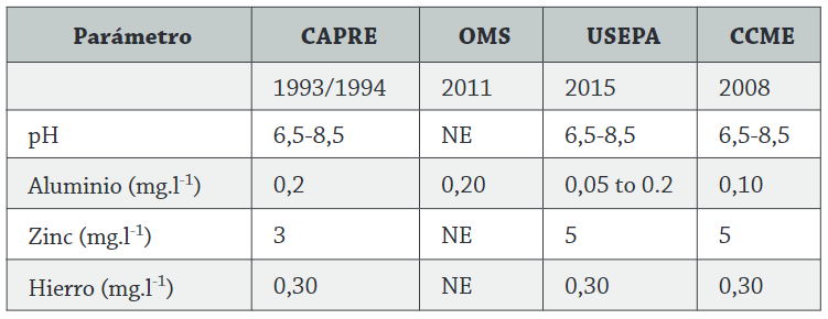 Se estimó la calidad del agua comparando los resultados con estándares, directrices o criterios recomendados por agencias nacionales e internacionales como: Norma de Calidad del Agua para Consumo Humano (CAPRE, 1994), Guías establecidas por Organización Mundial para la Salud (OMS, 2006), Consejo Canadiense de Ministros del Medio Ambiente (CCME, 2019), guías establecidas por la Organización de Agricultura y Alimento (Ayers R. S., Westcot D. W., & FAO, 1985) y las normas descritas por la Agencia de Protección Ambiental de Estados Unidos (USEPA, 2017). Estas agencias establecen valores para los distintos usos del agua, consumo humano, protección de la vida acuática (aguda y crónica) y uso agrícola (irrigación y ganadería).