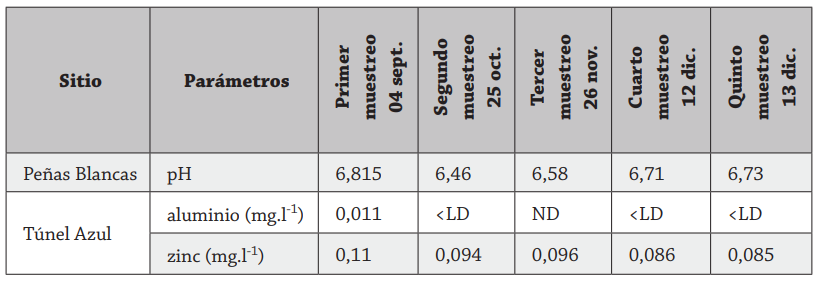 En el sitio de Peñas Blancas, el pH se encontró ligeramente por debajo del rango establecido por la CAPRE, EPA y CCME para consumo humano ya que lo establecen en un rango muy estrecho. En el Túnel Azul, los valores encontrados para aluminio y zinc se encuentran dentro de los rangos establecidos por la CAPRE, OMS, USEPA y CCME y FAO para todos los usos del agua, no obstante, supera en el primer muestreo las directrices que establece la CCME para protección de la vida acuática. (Tabla 5)