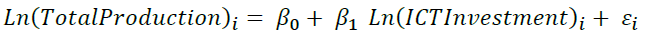 The OLS method is employed using a “Log-Log” model. This model is performed because the nonlinearity evidence in parameters between the studied variables (the ICT investment and the total production) (see Appendix 1). The log transformation generates the desired linearity in parameters, which is one of the OLS assumptions, and the interpretation of the regression coefficients is straightforward. The coefficients in a “Log-Log” model represents the elasticity of the variable Y with respect to X. In order words, the coefficient is the estimated percentage change in the dependent variable, for every percentage change in the independent variable. In addition, the highest correlation coefficients between Ln_ICT_Investment and Ln_Total_Production is another strong argument to employ this model. The “Log-Log” regression is determined as follows (Equation 1):