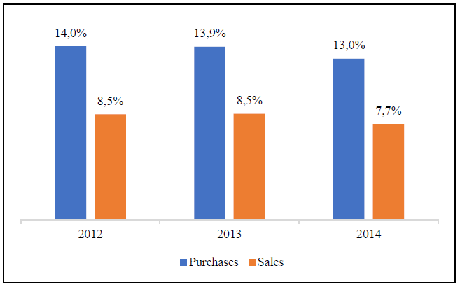 On average, 13.9% of the total manufacturing companies use the Internet to make purchases, while 8.2% of firms cover their sales by the Internet during 2012-2014. However, there is a significant reduction in the number of manufacturing companies that make purchases and sales, 11.0% and 12.9%, respectively (Figure 7).