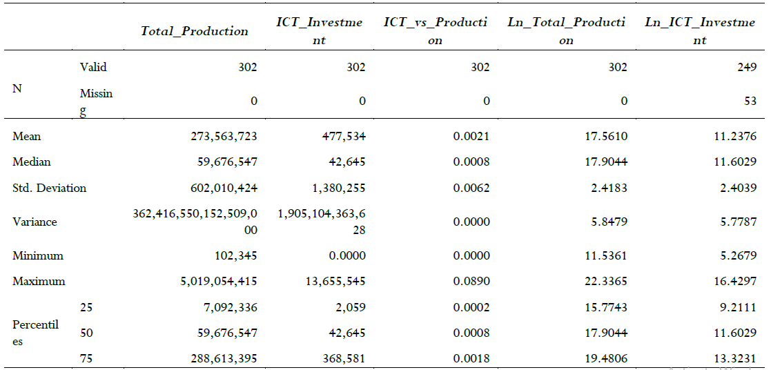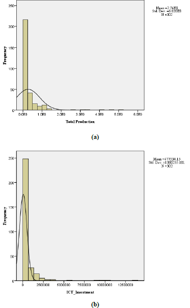 The standard deviation for the total production and the ICT investment is large because both series present extreme values, dispersion of data (data points are spread out over a wider range of values), and their mean is not enough characterized for all the surveyed companies. In addition, the dispersion depends on the economic resources invested in ICT per size of company. For instance, the big companies represent in average 94.4% of the total ICT investment in the manufacturing sector, while small firms and microenterprises contribute with 0.5% of the total ICT investment. Moreover, firms considered as big, medium A and medium B, suggest a 72.2% of the total production in the manufacturing sector; while small companies and microenterprises signify 27.8% of the total. In Appendix 2, histograms for the total production and the ICT investment are presented. The main statistics are shown below (Table 4).