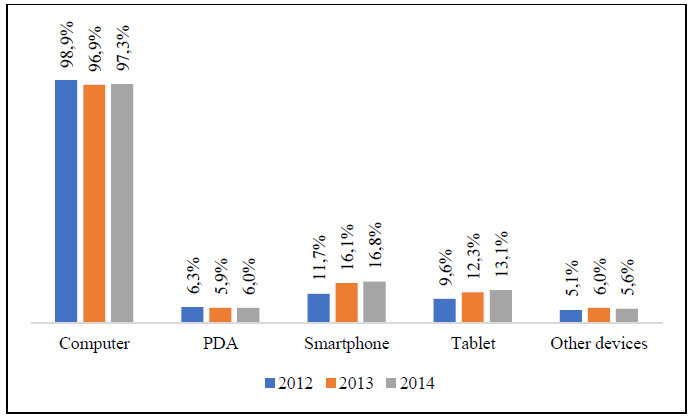 The number of devices used by manufacturing companies to develop their economic activities has been maintained during the studied period, varying by 1.1% (from 1,800 to 1,819 technological devices during 2012 and 2014, respectively). In 2014, 70.1% of the total possession of technological devices corresponds to computers, while 12.1% are smartphones and 17.8% represent other devices (grouped: PDA, tablet and other devices) (Figure 4).