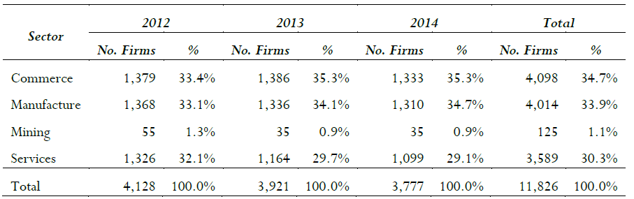 The category of big companies is the most representative during 2012-2014, its average contribution is 38.5% while the small companies symbolize 27.8%. The big, medium B and small firms represent on average 93.6% of the total sample during the analyzed period. The microenterprises do not record their information during 2012 and 2013 because the statistical sample is not representative of the study according to the Manufacturing, Mining, Internal Commerce and Services Survey (Table 3).