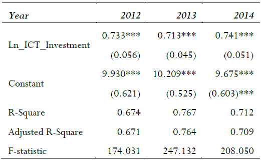 For instance, the elasticity for 2014 is 0.741, consequently a 1 percentage increase in the ICT investment is associated with a 0.741 percentage growth in the total production of the manufacturing companies, on average. Furthermore, 71.2% of the variation of total production is explained by this model.