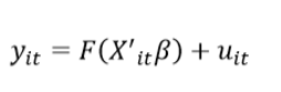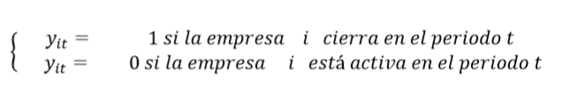 Donde 𝐹(. ) es una Fución de Distribución Acumulada (FDA), 𝛽 un vector de parámetros desconocidos k- dimensional y 𝑢𝑖𝑡 un término de error con 𝐸(𝑢𝑖𝑡) = 0. 𝑋𝑖𝑡 es una matriz que incluye factores determinantes del cierre empresarial tales como nivel de ingresos por ventas, activo fijo neto, cuentas por