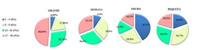 En cuanto al tamaño empresarial las organizaciones consideradas empresas medianas cuentan con un 15.7% de representación, siendo estas aquellas que generan ingresos por ventas entre 1 y 5 millones de USD y/o tiene entre 55 a 199 trabajadores. Por otro lado, el 45.6% son consideradas pequeñas empresas, es decir que no exceden los 2 millones de USD y/o cuentan con un personal que no supere a los 50 empleados; así mismo las microempresas representan un 38.7% con respecto a las MIPYMES en el Ecuador, siendo organismos que no exceden los 10 trabajadores dentro de su nómina y/o no generan ingresos por ventas