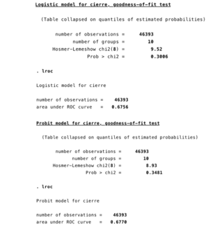 e realizaron las estimaciones utilizando los modelos probit, logit y cloglog, y se efecturaron pruebas de bondad de ajuste con las cuales se pudo constatar la robustez de los mismos. En la sección Anexos se puede observar los resultados obtenidos en las pruebas de Hosmer-Lemeshow y la curva de roc; con el primero, que mide la calibración del modelo, es decir, el grado en que la probabilidad predicha coincide con la observada, se encuentra que el modelo tiene un buen ajuste, pues no se rechaza la hipótesis nula. Por otro lado, la curva de roc que evalúa la discriminación, es decir, el grado en el que el modelo distingue entre las firmas que cerraron y las que no lo hicieron, presenta un área de 0.677, lo cual indica que existe un 68% de probabilidad de que la predicción de cierre de una empresa sea correcta de acuerdo al modelo planteado.