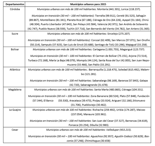 Cabe señalar que los municipios urbanos se entienden como aquellos que, según la Ley 388 de 1997, clasifican como entidades eminentemente urbanas –con población mayor a 100 mil habitantes– o que son catalogados en transición – aquellos con población entre 30 mil y 100 mil habitantes– (ver Tabla No. 2. Municipios urbanos, por departamento, de la región Caribe).