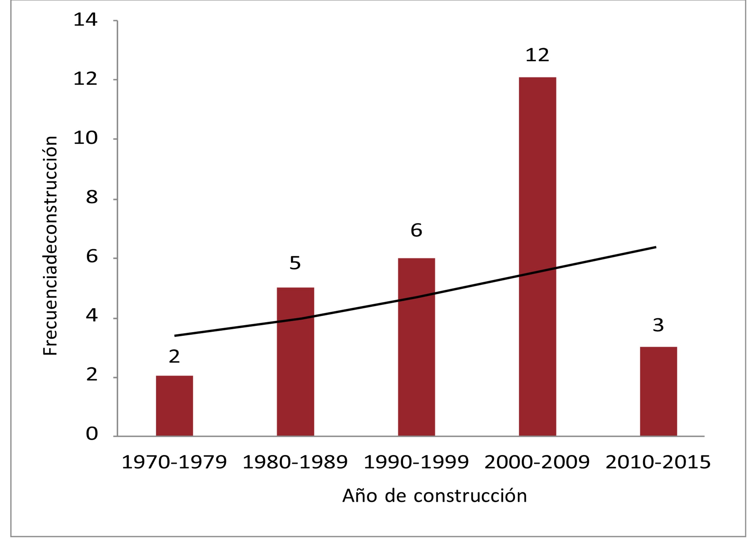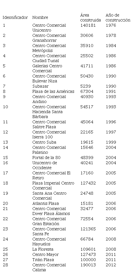 Una vez identificadas las direcciones, se procedió a georreferenciarlas en la base predial para calcular las áreas construidas de cada uno de los centros comerciales y filtrar aquellos que tuvieran más de 30.000 mt2 de construcción, por considerar que es el área promedio de los grandes Malls2 en el mundo (Baek, 2015, p. 429). Para obtener el año de construcción, se revisaron los sitios web de cada uno de los centros comerciales y se obtuvieron los valores de vetustez de las construcciones, a partir de la base de datos de la Unidad Administrativa de Catastro Distrital (2015).