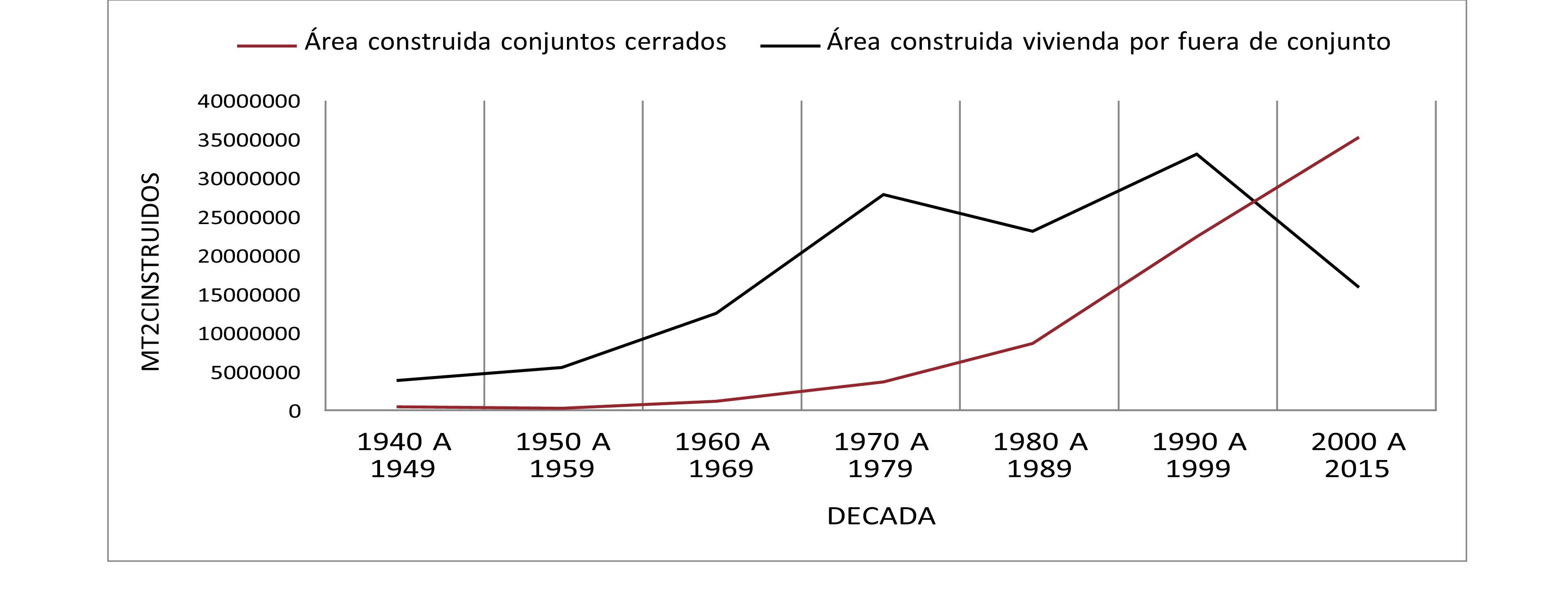 Obsérvese en la Figura 2 cómo, de manera contraria, la dinámica de construcción de conjuntos cerrados se ha mantenido en aumento desde el año 1940, resaltando particularmente los incrementos exponenciales a partir de los años 80 y los primeros 15 años del siglo XXI. Los conjuntos cerrados pasaron de representar el 5% del total del área construida para la ciudad, a ser el 68%, en el transcurso de 70 años. Sin embargo, el gran salto se dio entre 1990 y 2015, periodo durante el cual pasó de representar el 26% a ser el 68%; es decir que, en los últimos 25 años, la construcción de conjuntos cerrados se constituyó en la tipología predominante en la ciudad.
