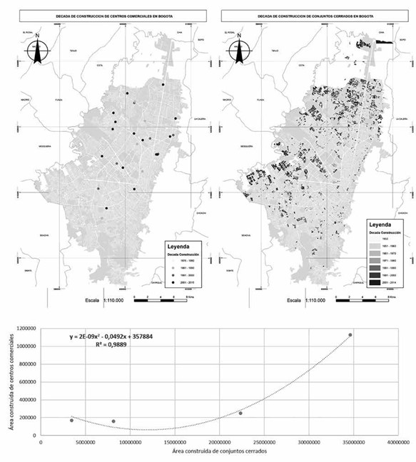 En Bogotá. la producción del espacio urbano, durante los últimos 25 años, ha estado marcada por el predominio de los centros comerciales y los conjuntos cerrados. Las pruebas estadísticas permiten aprobar la hipótesis de que son los principales productos inmobiliarios con los que se ha construido la ciudad, en sus últimas décadas, y que durante los periodos de construcción existe una alta correlación entre ellos.