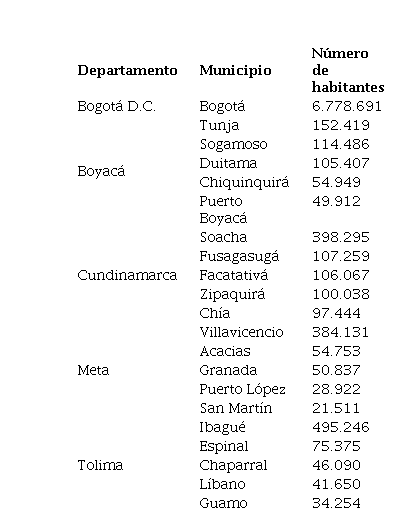 Keywords: Urban studies, regions, territorial order, city system, central región, Bogotá, Boyacá, Cundinamarca, Meta, Tolima.