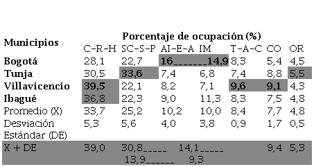 El funcionamiento de la RAPE-RC, a partir de la gran encuesta integrada de hogares - GEIH (DANE, 2016), muestra que las ciudades de Bogotá, Tunja, Villavicencio e Ibagué presentan diferentes niveles de especialización, categorizados de acuerdo a la ocupación de los habitantes en siete sectores productivos (Tabla 2). En términos de especialización, Bogotá se destaca en dos sectores relacionados con la industria manufacturera y las actividades inmobiliarias, empresariales y de alquiler. Le sigue la ciudad de Villavicencio, que se especializa en tres sectores relacionados con el comercio, restaurantes y hoteles; el transporte, almacenamiento y comunicaciones; y las construcciones. En el caso de la ciudad de Ibagué, esta presenta especialización en los sectores de industria manufacturera y de comercio, así como de restaurantes y hoteles. Finalmente, la ciudad de Tunja se especializa en el sector de los servicios comunales, sociales y personales. Para la RAPE-RC, se constituye en una ventaja el hecho de contar con ciudades especializadas en diferentes sectores productivos, lo cual complementa la dinámica económica y social para la integración regional, la productividad y la competitividad.