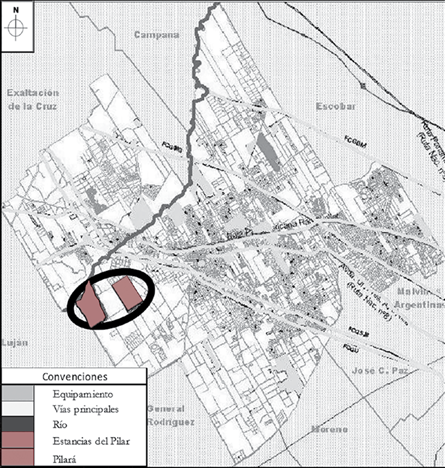 En lo que hace a los instrumentos de GU implementados por las instancias locales, Estancias del Pilar es una urbanización cuya aprobación se hizo bajo lo dispuesto por la primera normativa provincial referida a los barrios cerrados (Resolución 74, 1997), al tiempo que la Provincia continuaba siendo la encargada de entregar la Factibilidad Final. En la escala local, se utilizó el Código de Zonificación propio (Ordenanza 10, 1985) y las reglamentaciones complementarias: mediante Ordenanza 112, 1997, se otorgó el consentimiento para cambiar de zonificación aquellas parcelas necesarias, afectando la UC al régimen de propiedad horizontal. 3.3. Primera década del año 2000: Pilará El proyecto se destaca por ser uno de los más grandes, dentro del conjunto de emprendimientos cerrados instalados en el municipio, así como por las particularidades que signaron su gestión y desarrollo (conflictos entre la empresa promotora y el gobierno local, y entre la primera y la sociedad local).