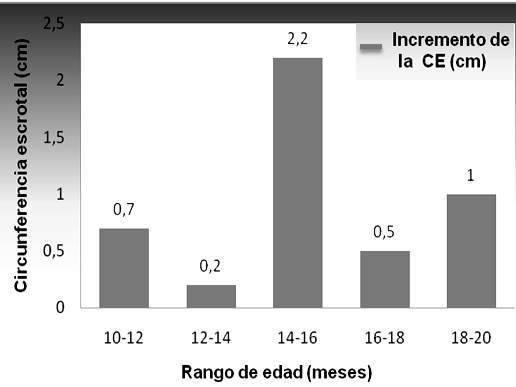 En la figura 1 se presenta el crecimiento de la CE en los periodos evaluados, en donde el menor valor es de 0,2 cm entre los 12 a 14 meses y el mayor incremento se obtuvo en el periodo de 14 a 16 meses siendo este de 2,2 cm. Se infiere que el crecimiento de este órgano no fue exponencial, es decir no tuvo un incremento constante, como lo han sugerido algunos autores (WITTMAN, 2005). No obstante, este mismo autor y otros investigadores (PIRES et al., 2000) han afirmado que el crecimiento de determinados órganos, como los huesos y músculos se pueden seguir en función del equilibrio del nitrógeno, del calcio y del fósforo, es decir si hay gran aporte de estos minerales se tendrá una mayor tasa de crecimiento. Los órganos tampoco presentan un crecimiento homogéneo, cada uno crece a velocidades distintas, depende entre otras cosas de cuando se necesite la función de dicho órgano durante la ontogénesis. Es decir para el caso del incremento en el tamaño testicular se aplican los principios arriba descritos.