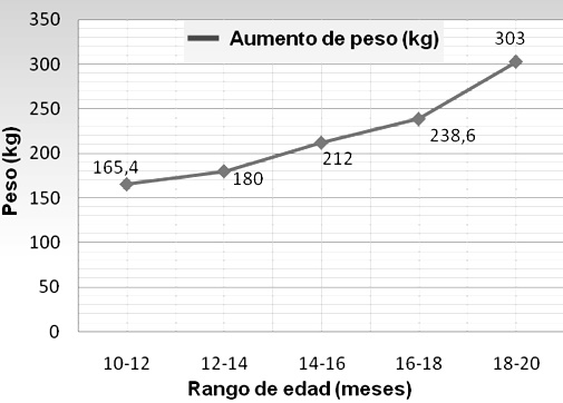 Peso. En general, durante el periodo evaluado el grupo de animales en estudio presentó una ganancia de peso de 161,7 kg, con ganancia diaria de 531,9 g, desde el destete hasta los 20 meses de edad.
