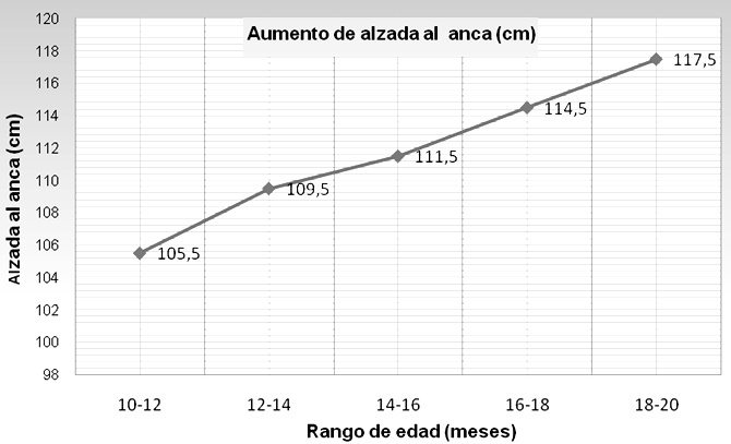 El Incremento promedio de la alzada al anca a lo largo del estudio se puede apreciar en la figura 3. La tabla 3, muestra las correlaciones existentes entre CE con los parámetros morfométricos evaluados: edad, peso, longitud testicular (derecha - izquierda) y alzada al anca.