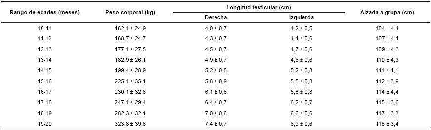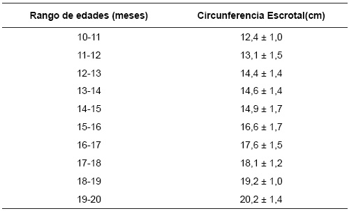 Circunferencia escrotal. Los valores de CE estuvieron entre 12,4 ± 1,0 cm y 20,2 ± 1,4 cm, en el inicio y final del periodo evaluado, presentándose un aumento con valor promedio total de 7,8 cm. Resultados similares han sido reportados por ECHEVERRI (2006), en el mismo grupo racial, con CE de 14,6 y 20,2 cm a los 12 y 22 meses de edad respectivamente. Al comparar los valores medios de la CE observados en el presente estudio con los obtenidos por CRUDELI et al. (2007) y CRUDELI y KONRAD (2013) en la raza Mediterránea, se encontró, que los animales de raza Mediterránea presentaron mayores valores de CE (21,5 cm), en el rango de edad entre 18 - 22 meses, lo que podría ser explicado, por la oferta nutricional ofrecido a esos animales. Según VALE et al. (2004), en la raza Murrah, la CE ideal para los sementales con edades entre 30 y 36 está alrededor de 30 ± 3,6 cm, habiendo un crecimiento lineal y correlación positiva (r >0,90) con el peso corporal y la edad del animal.